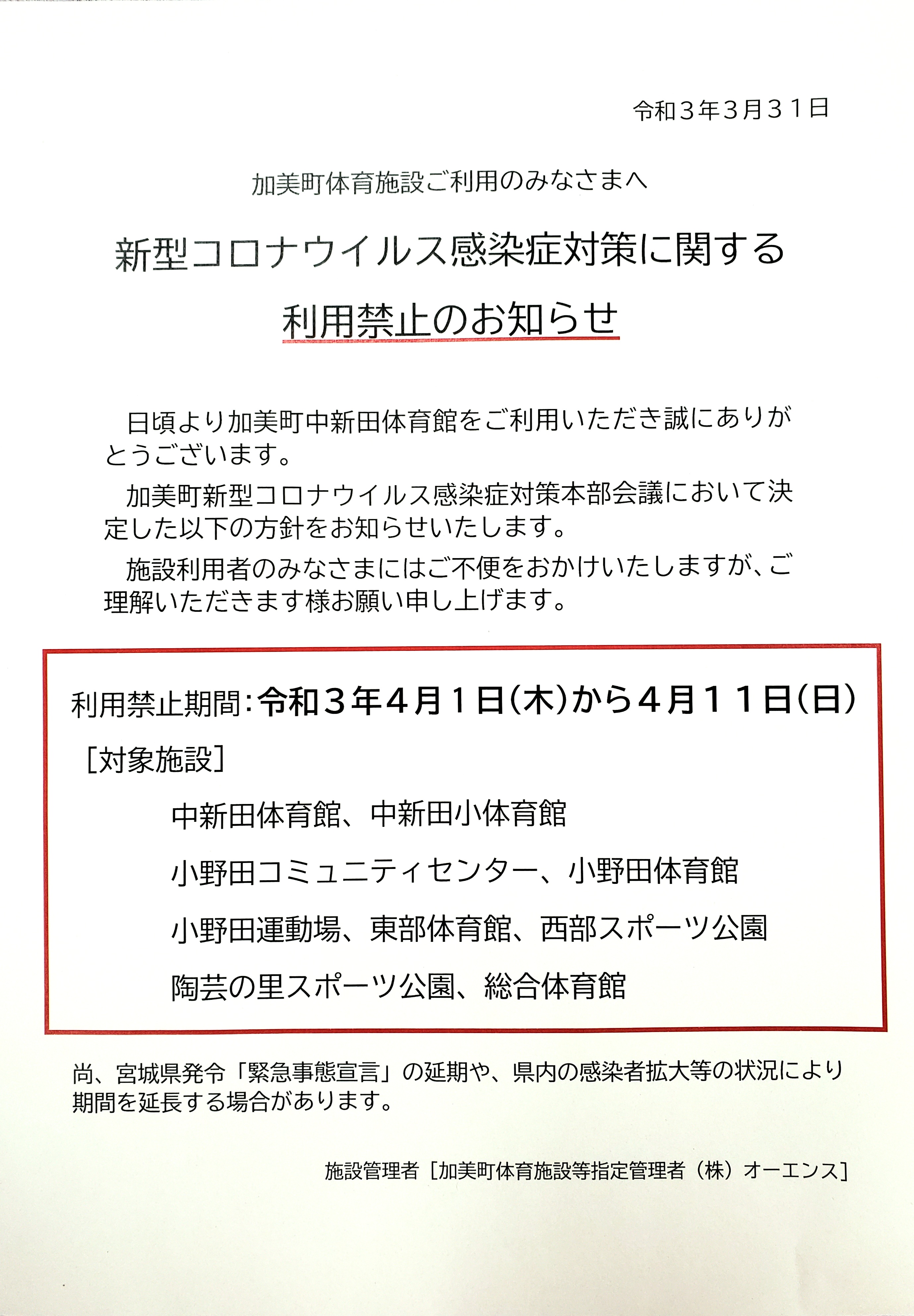 【令和3年4月1日(木)〜4月11日(日)】 加美町体育施設等9施設 利用禁止となります。
